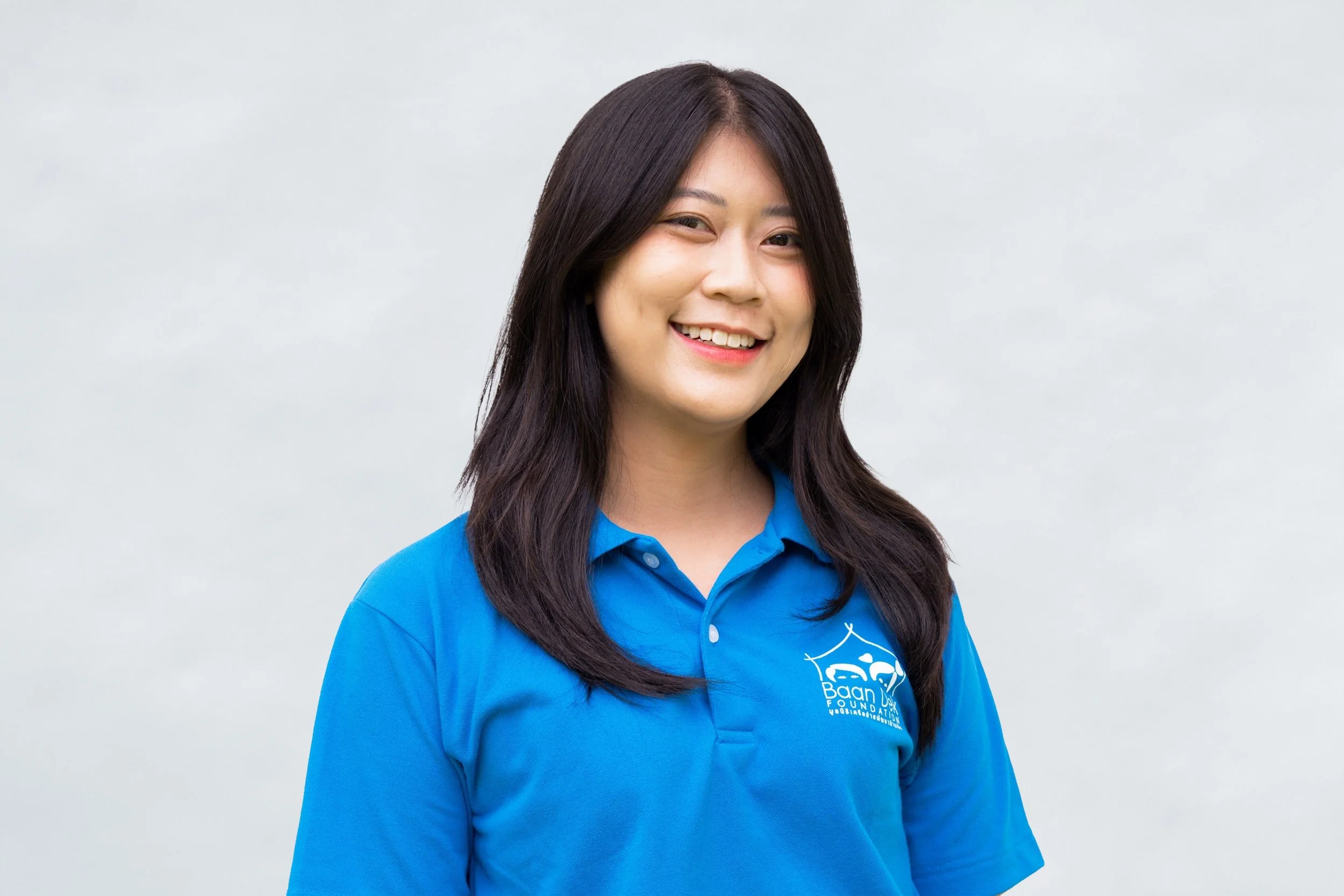 • A woman in a blue polo shirt with the logo of Baan Dek Foundation, smiling and standing in front of a plain white wall.